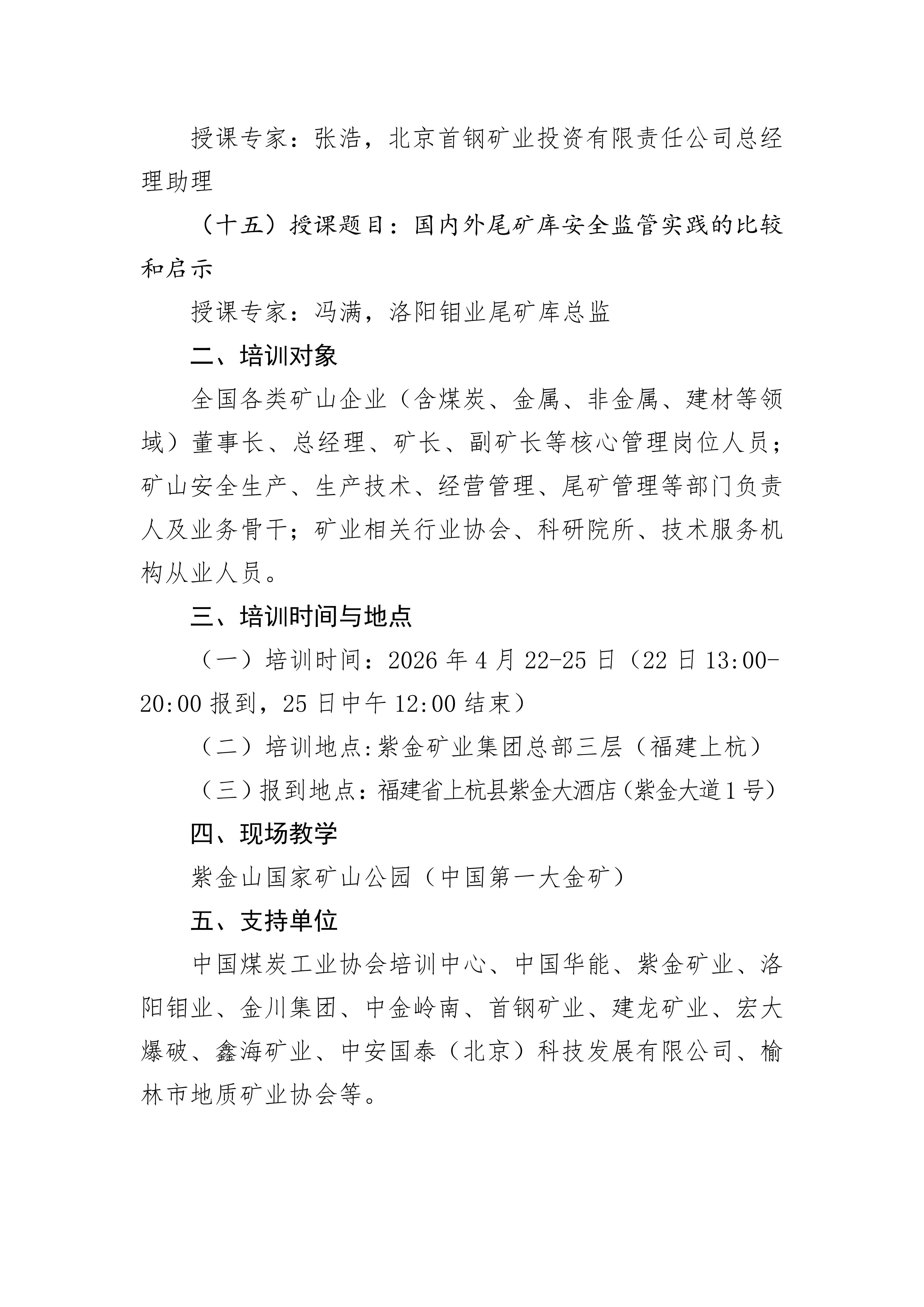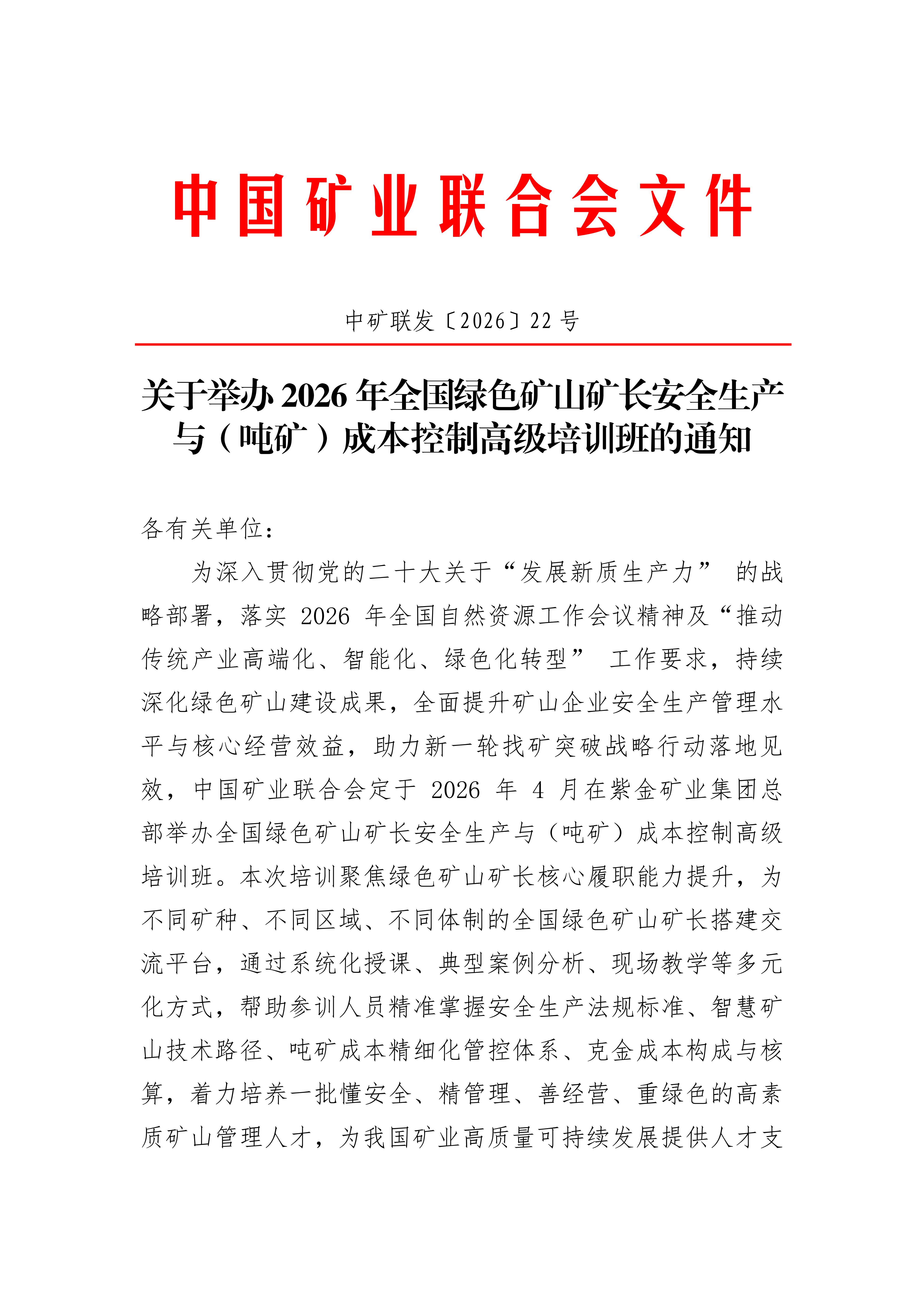 为深入贯彻党的二十大关于“发展新质生产力” 的战略部署,落实 2026 年全国自然资源工作会议精神及“推动传统产业高端化、智能化、绿色化转型” 工作要求,持续深化绿色矿山建设成果,全面提升矿山企业安全生产管理水平与核心经营效益,助力新一轮找矿突破战略行动落地见效,中国矿业联合会定于 2026 年 4 月在紫金矿业集团总部举办全国绿色矿山矿长安全生产与(吨矿)成本控制高级培训班。现将培训班具体事宜通知如下: