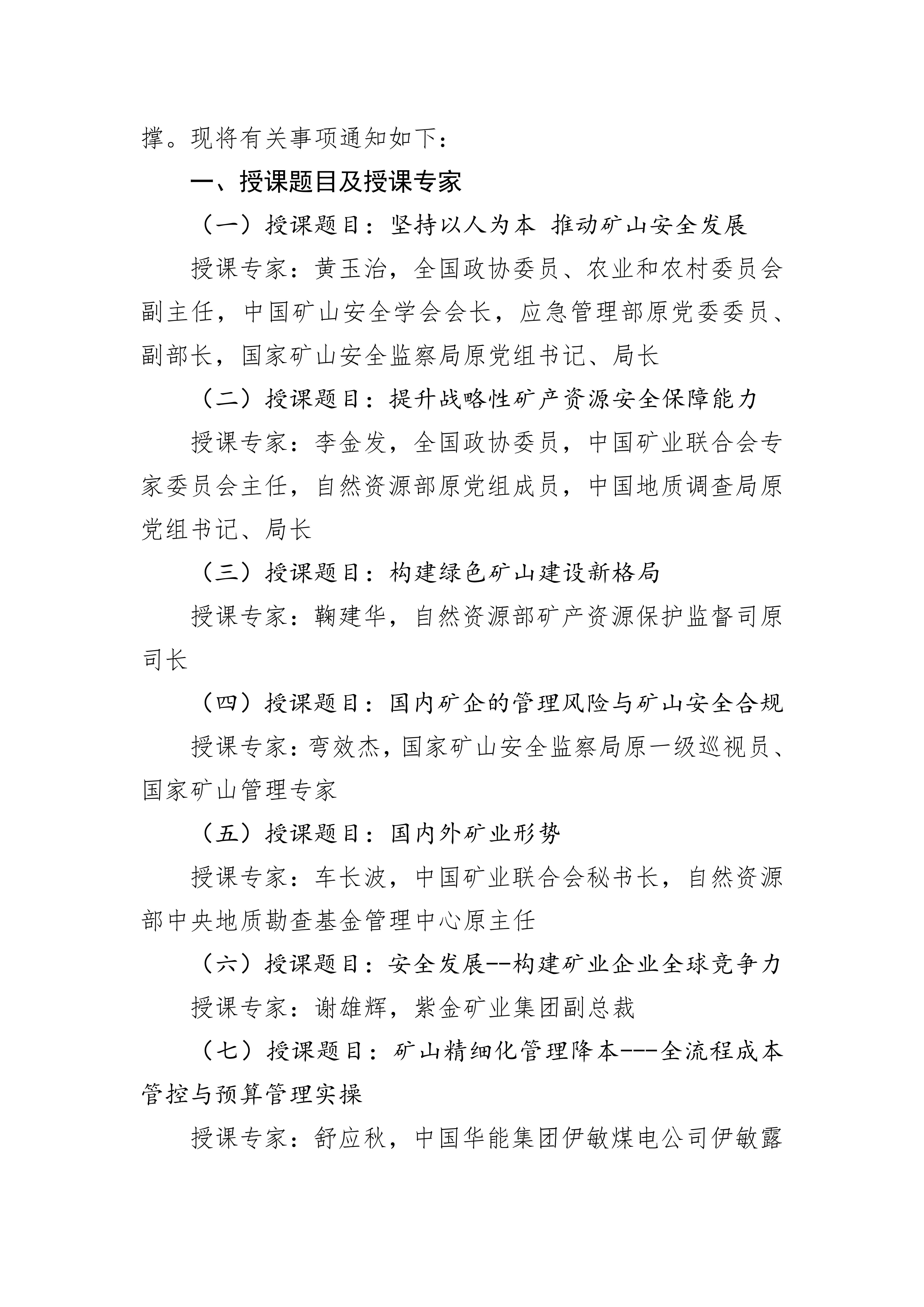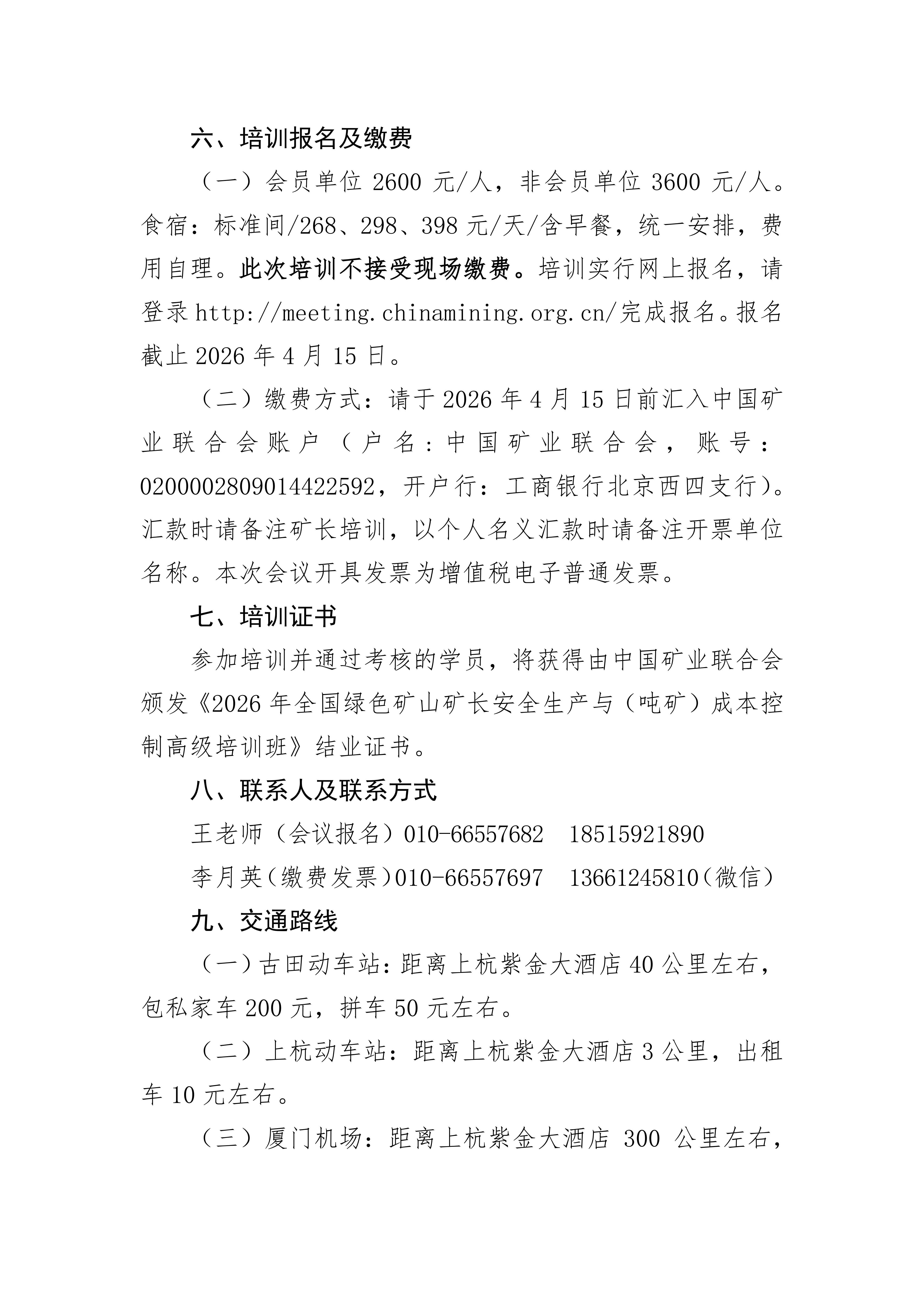 为深入贯彻党的二十大关于“发展新质生产力” 的战略部署,落实 2026 年全国自然资源工作会议精神及“推动传统产业高端化、智能化、绿色化转型” 工作要求,持续深化绿色矿山建设成果,全面提升矿山企业安全生产管理水平与核心经营效益,助力新一轮找矿突破战略行动落地见效,中国矿业联合会定于 2026 年 4 月在紫金矿业集团总部举办全国绿色矿山矿长安全生产与(吨矿)成本控制高级培训班。现将培训班具体事宜通知如下: