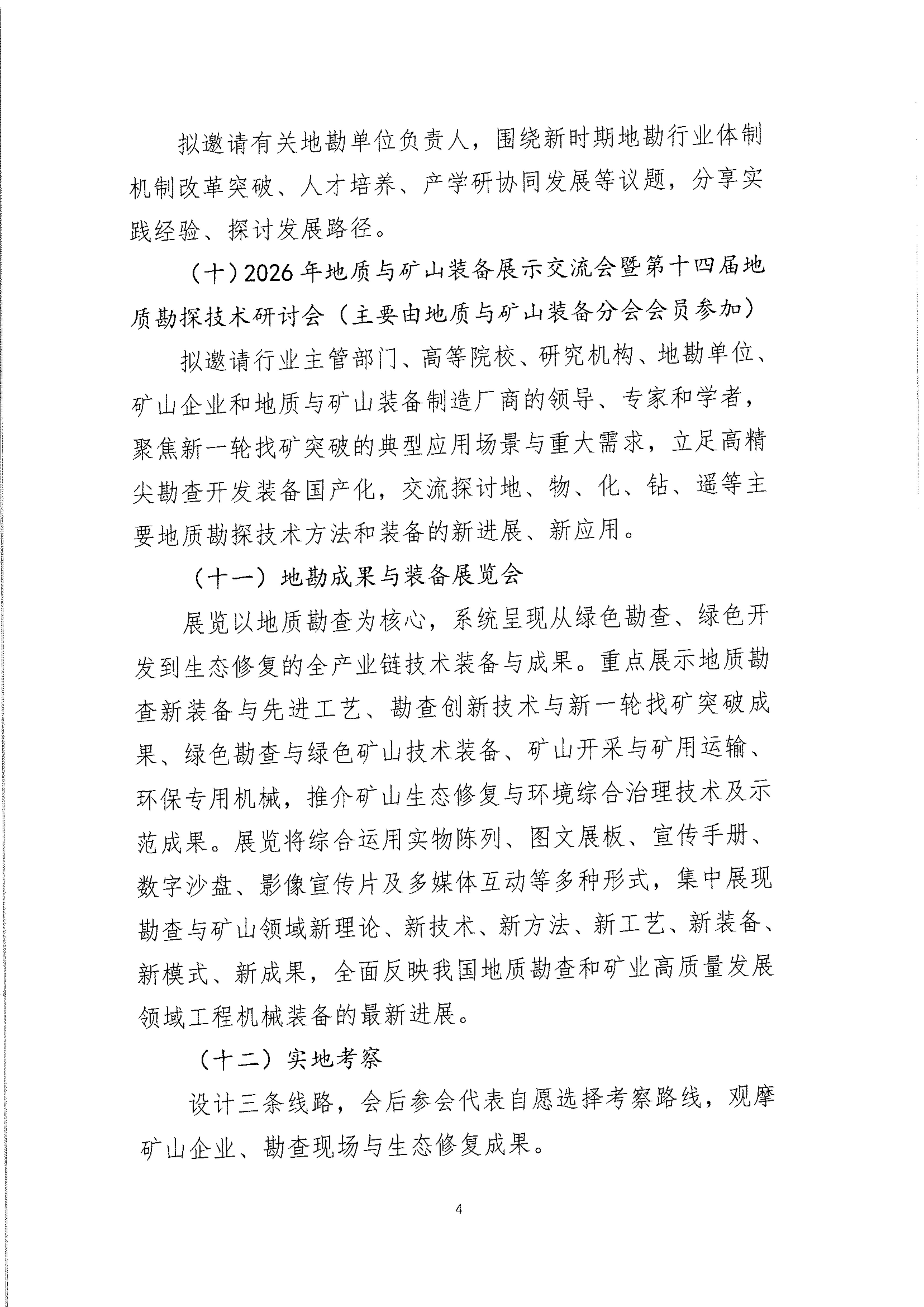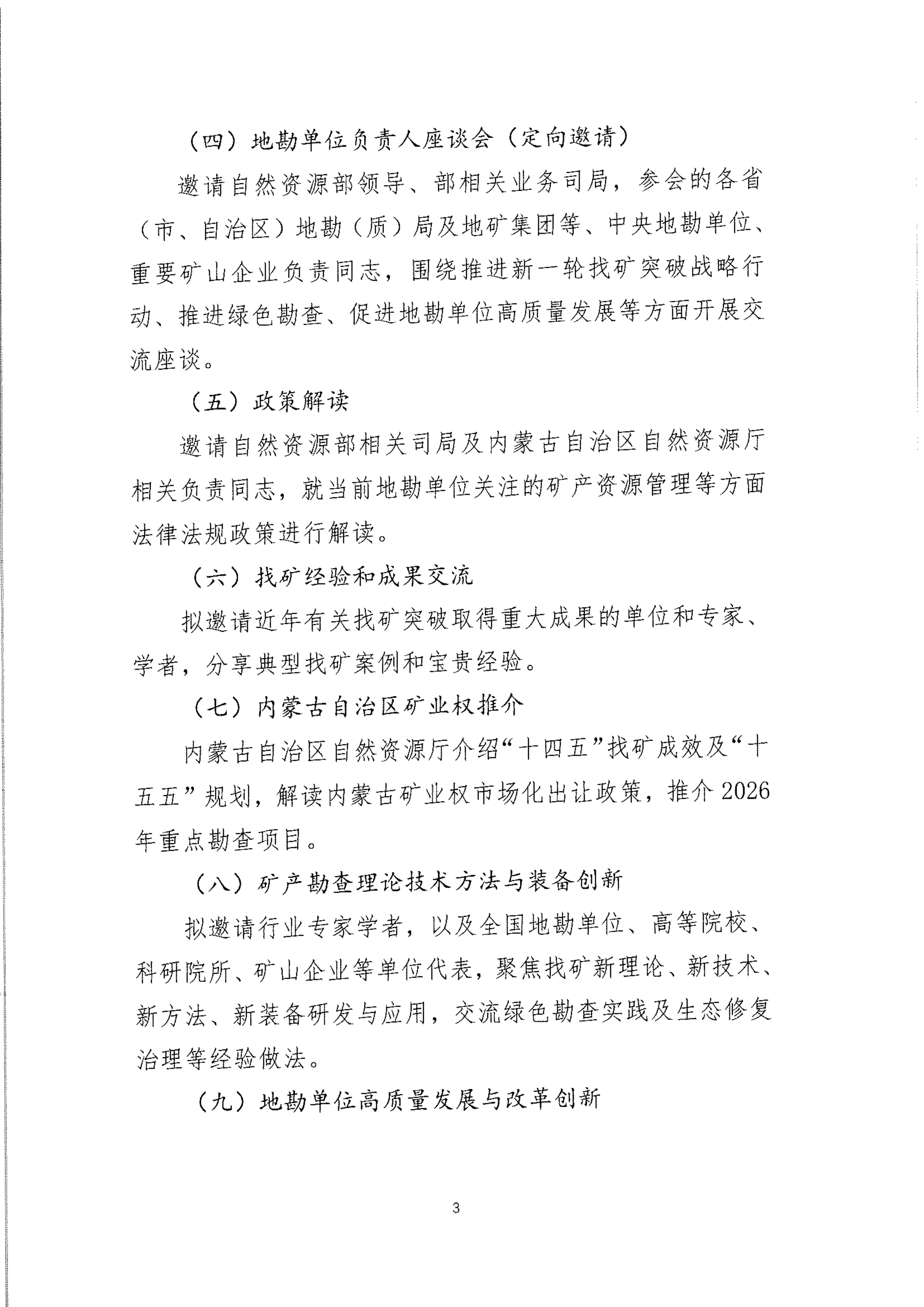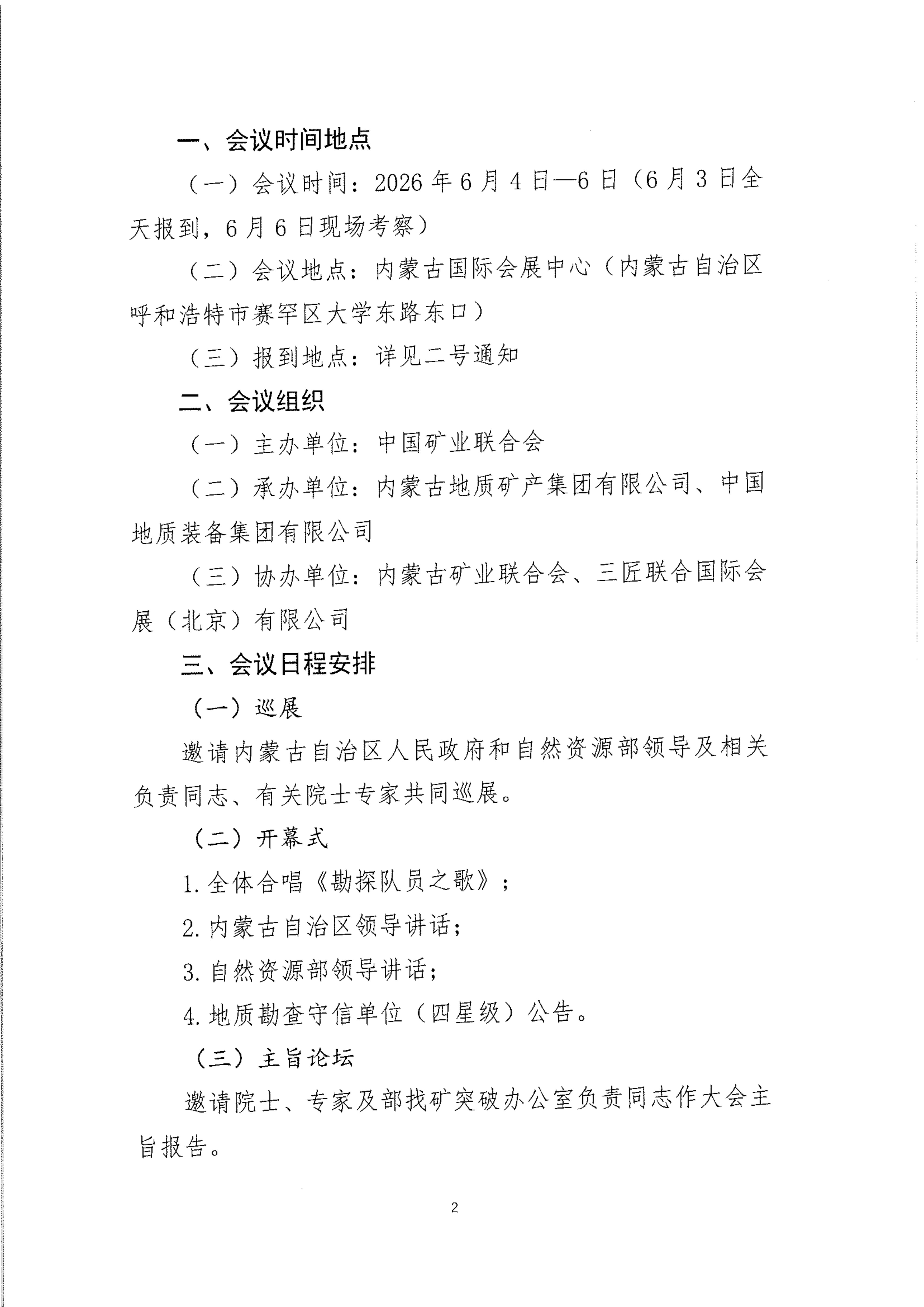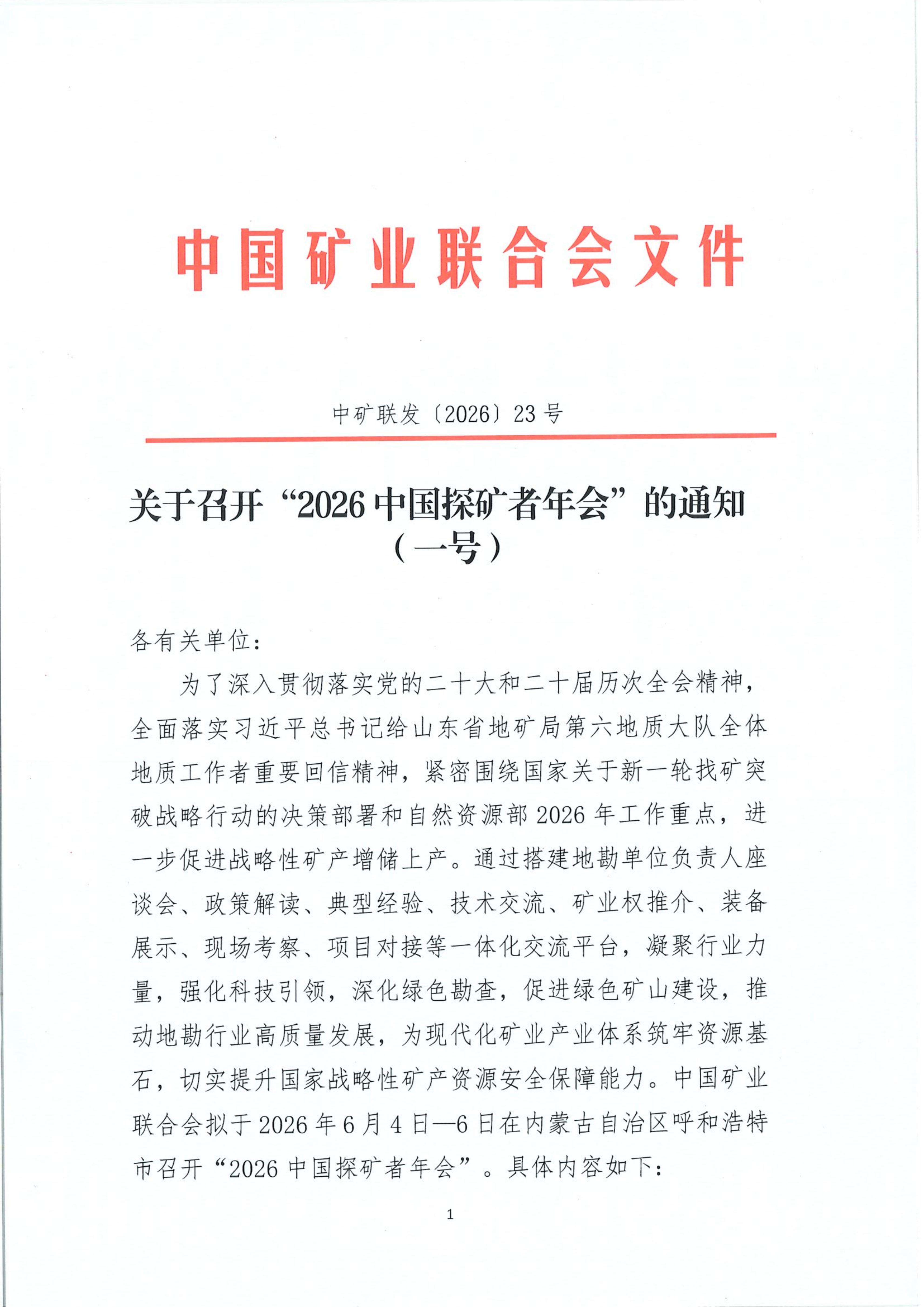 为了深入贯彻落实党的二十大和二十届历次全会精神,全面落实习近平总书记给山东省地矿局第六地质大队全体地质工作者重要回信精神,紧密围绕国家关于新一轮找矿突破战略行动的决策部署和自然资源部2026年工作重点,进一步促进战略性矿产增储上产。通过搭建地勘单位负责人座谈会、政策解读、典型经验、技术交流、矿业权推介、装备展示、现场考察、项目对接等一体化交流平台,凝聚行业力量,强化科技引领,深化绿色勘查,促进绿色矿山建设,推动地勘行业高质量发展,为现代化矿业产业体系筑牢资源基石,切实提升国家战略性矿产资源安全保障能力。中国矿业联合会拟于 2026年6月4日-6日在内蒙古自治区呼和浩特市召开“2026中国探矿者年会”。具体内容如下:
